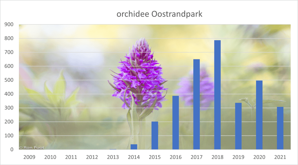 Volgens Jeroen Reinhold van Landschapsbeheer is de poldergrond zeer geschikt voor rietorchissen. Dus…gezaaid in 2012. En…de werkgroep ‘Rietorchisgroep’ genoemd. Het leek ons grootspraak, maar dat bleek het niet te zijn. In 2013 telden we er drie. Het jaar erna 38. En toen ging het snel met als topper in 2018 bijna 800 exemplaren.